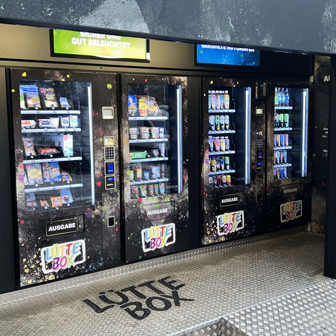 Direkt am Ostausgang des Warnow Parks ermöglicht ein moderner, videoüberwachter Automatenkiosk flexibles Einkaufen rund um die Uhr. An sechs Automaten finden Kundinnen und Kunden Lebensmittel wie Milch, Mehl, Käse und Wurst ebenso wie Getränke, Snacks und Drogerieartikel.
